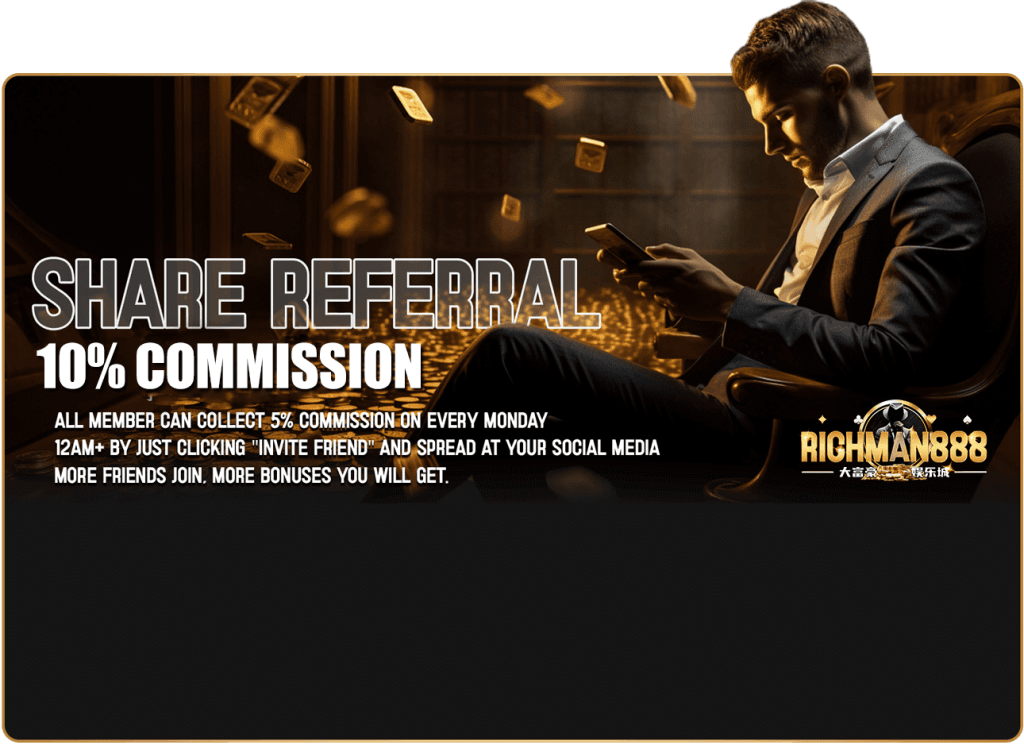 Richman888 Free Credit extends beyond a mere gaming platform; it’s a treasure trove of bonuses and promotions. From a generous 50% welcome bonus that greets new players to a 20% daily bonus, a 30% weekend bonus, daily missions to keep the excitement flowing, and a 5% commission referral bonus for those who bring friends into the fold — Richman888 ewallet ensures that every moment spent on the platform is laden with opportunities to boost one’s winnings.